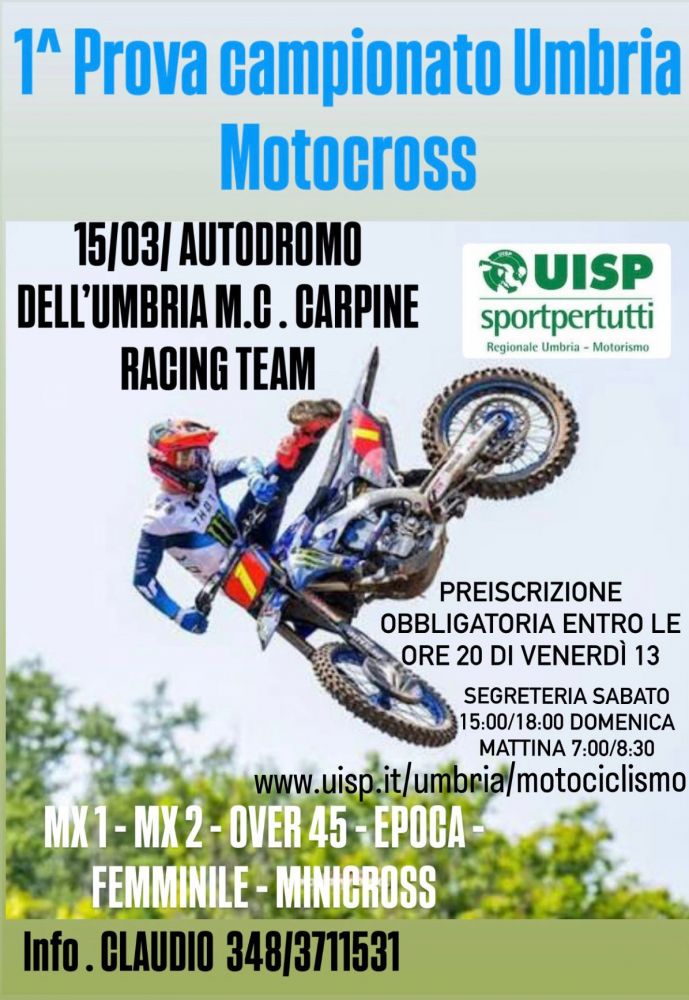 Domenica 15 marzo 2026 si svolgerà presso il Crossodromo "Magione" a Magione (PG) la 1° prova TROFEO UMBRIA MOTOROSS Mx1 - Mx2, Over 45, Femminile, Minicross ed Epoca. La manifestazione organizzata dal Moto Club Carpine Racing Team