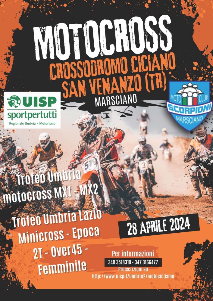 Domenica 28 aprile 2024 si svolgerà la 2° prova Trofeo Umbria Motocross Mx1 - Mx2, Trofeo 2T, Over 45, Epoca, Femminile e Minicross, presso il Crossodromo Loc. Cicciano a San Venanzo (TR) organizzata dal Moto Club Scorpioni.