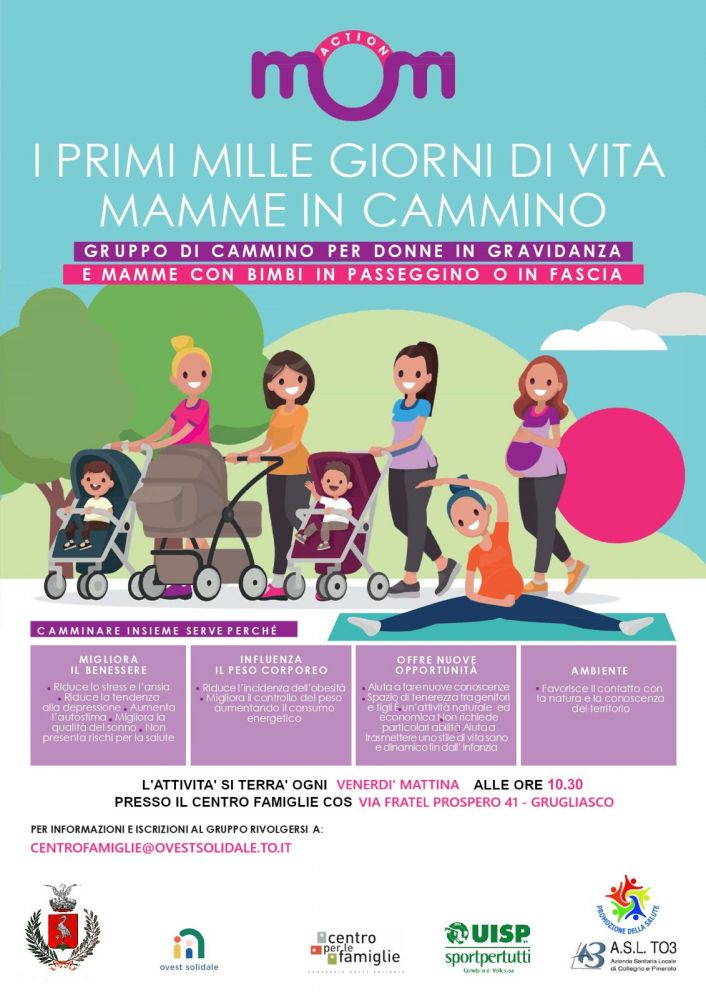 "Mamme in cammino" è un gruppo di cammino dedicato a donne in gravidanza e a mamme con bambini piccoli, che portano con sé in passeggino o in fascia. Il progetto nasce dalla collaborazione tra UISP Vallesusa, il Consorzio territoriale, il Centro per le Famiglie, i comuni di Collegno e Grugliasco, e AslTo3.